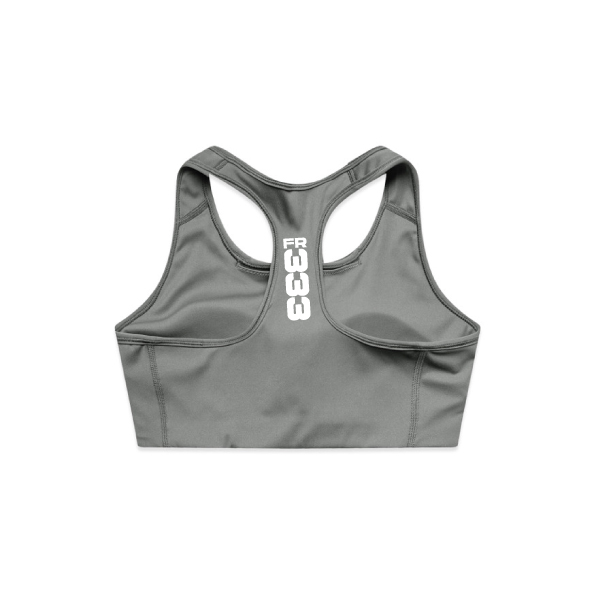Matte finish, continuous removable bust cup, racer back, internal elastic, moisture wicking, quick drying, high elastane content for resilience, suitable for low to medium impact activities