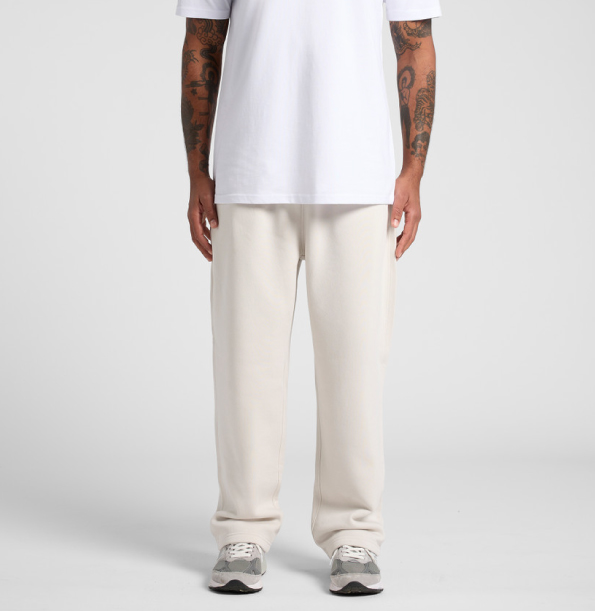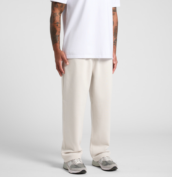 Relax cuffless trackpants in mid-weight 320 GSM fabric with 80% cotton and 20% recycled polyester. Features elastic waistband, tonal drawcord, two side pockets, and one back pocket.